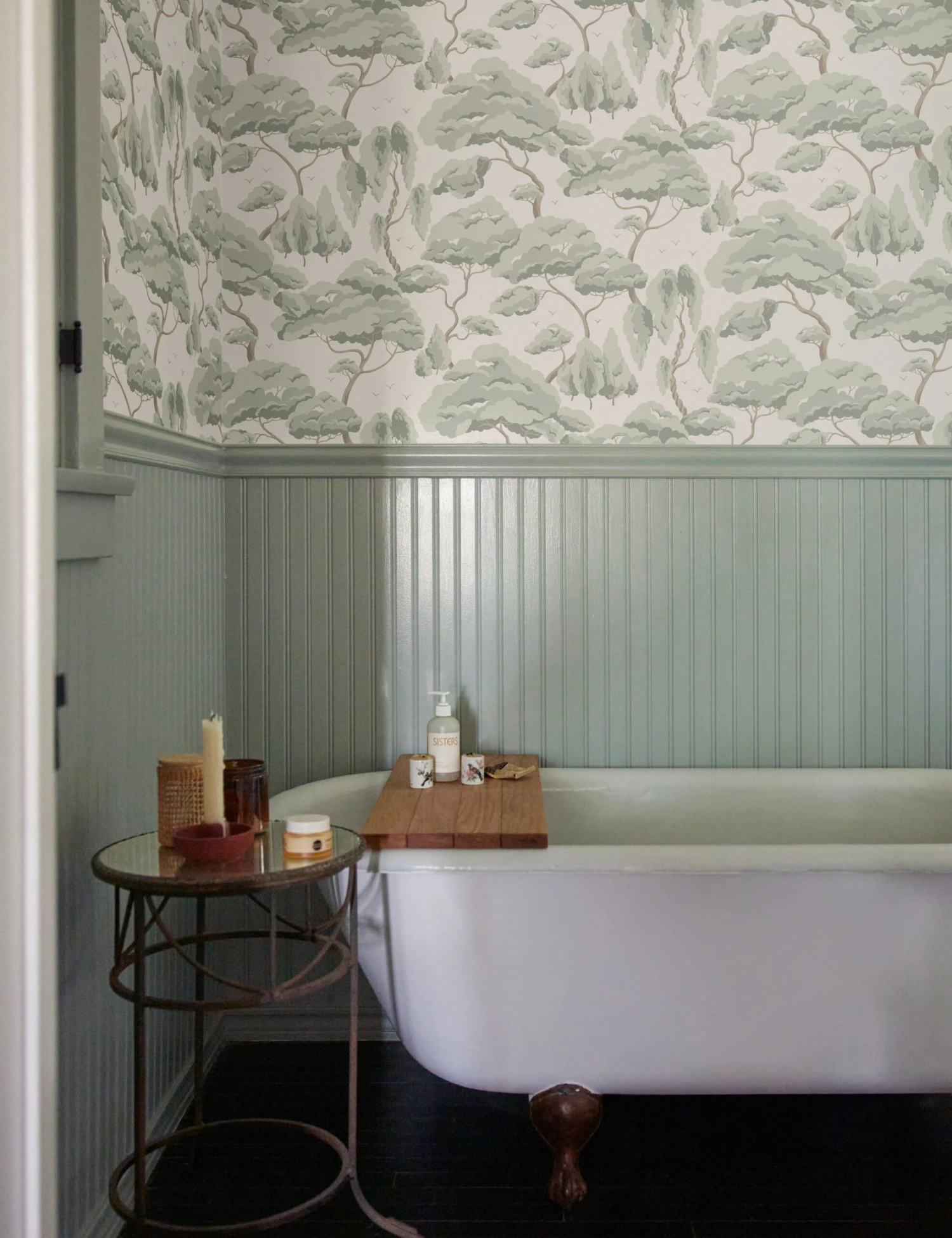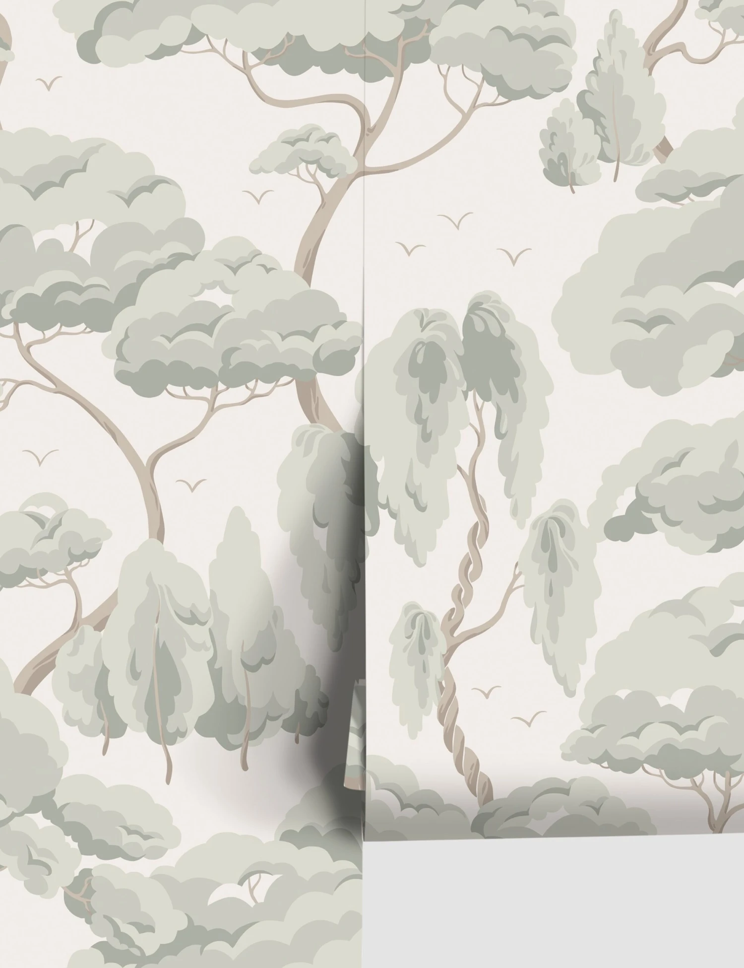 A lush forest grove unfolds in this naturally inspired wallpaper design. The soft pastel colors and whimsical illustrations make this versatile home wallpaper the perfect addition to a morning room or nursery.