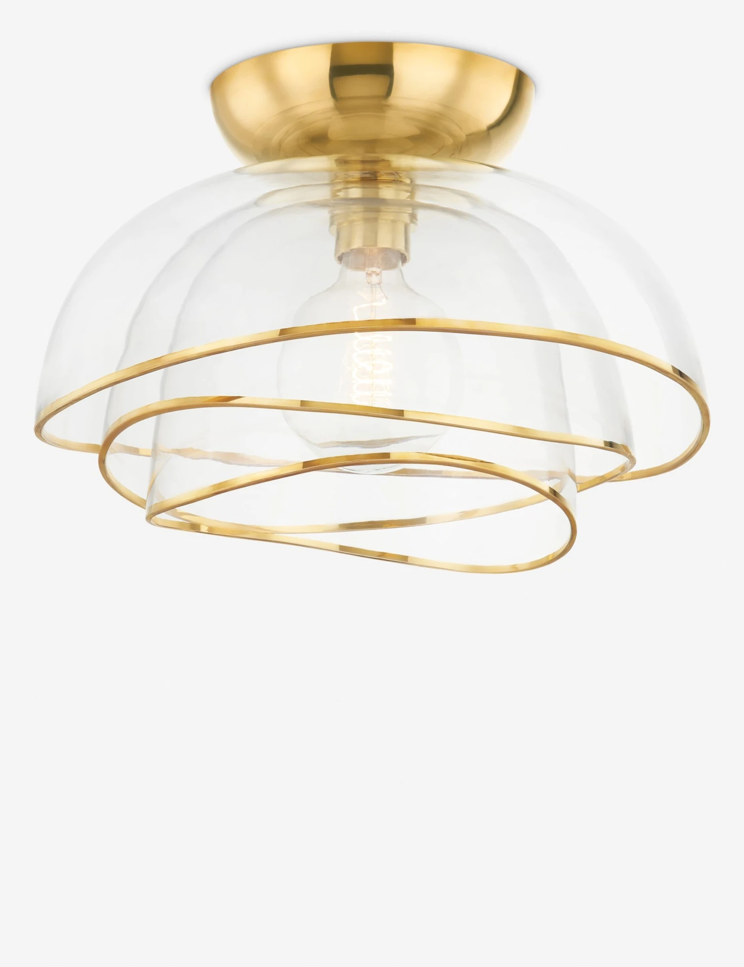 Add some drama overhead with this sculptural flush mount light. Three nested glass shades offer a sense of movement with their organic form outlined with a brass trim. This flush mount fixture is set to bring statement appeal to small-space design.