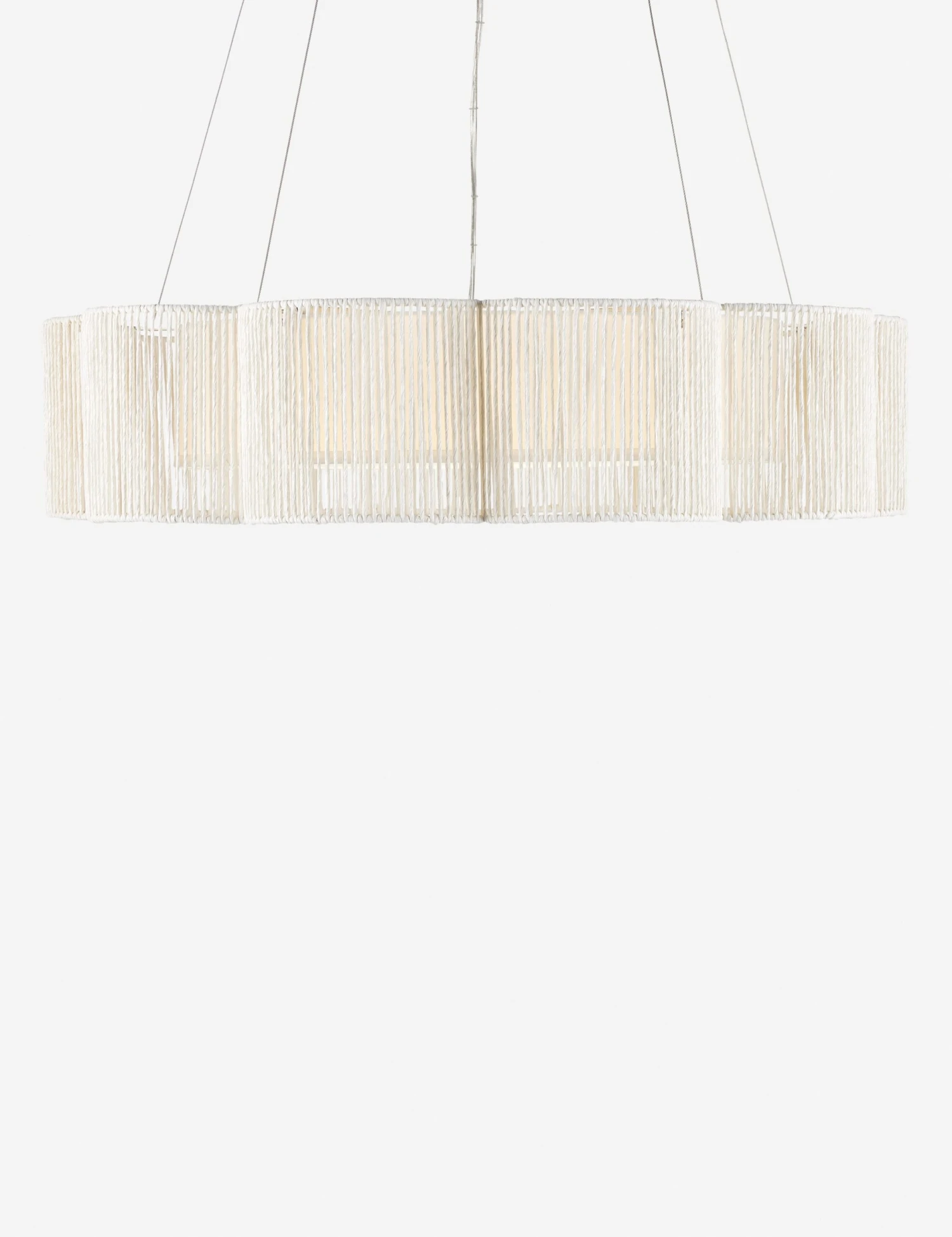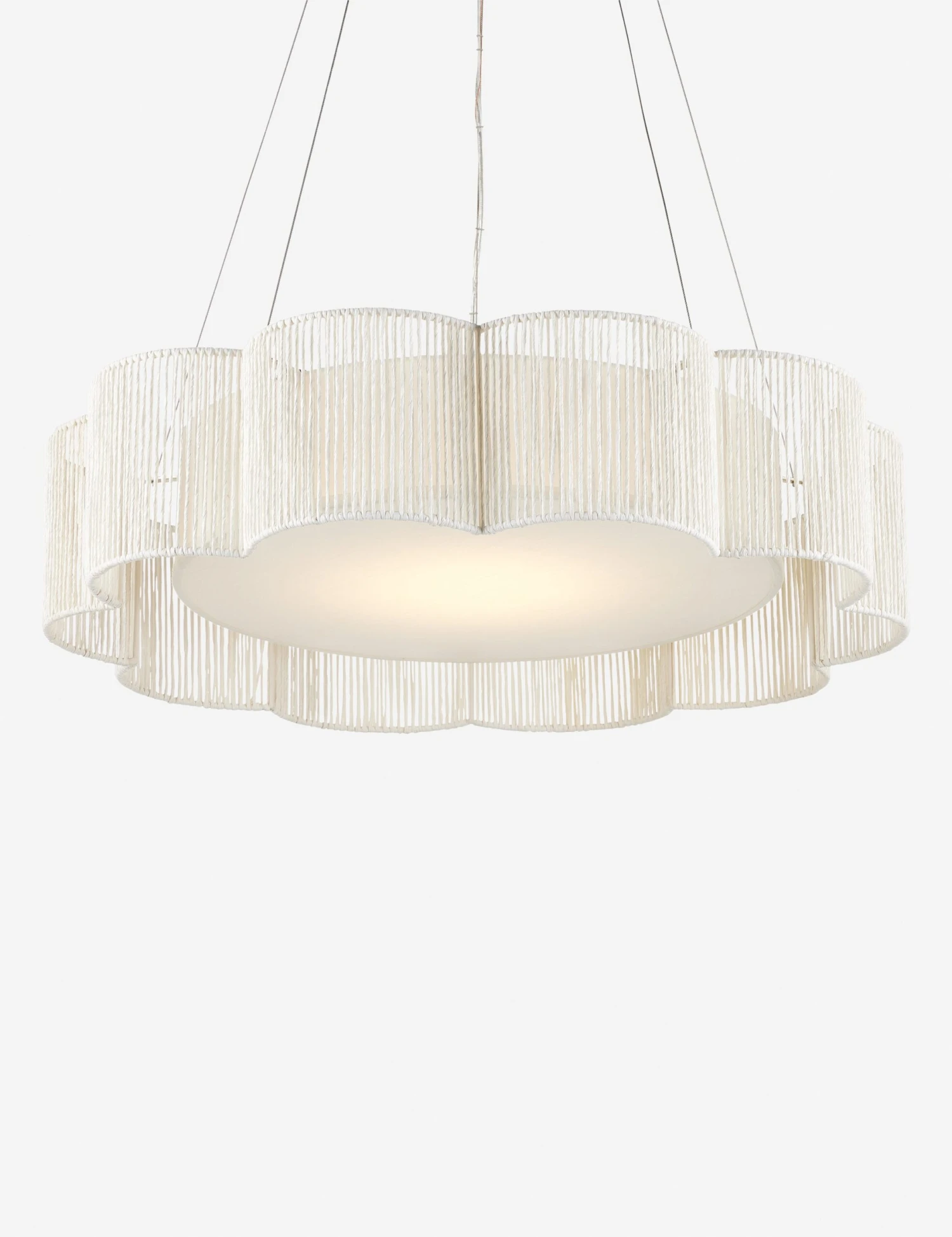 With its airy profile and white finish, the Winslow chandelier is an elegant centerpiece for a bright curation. Soft scalloped lines bring a flowing appeal to this chandelier design, suggesting a floral form. The frame is wrapped in twine for added texture and suspended with aircraft cable for a look that floats in the room.