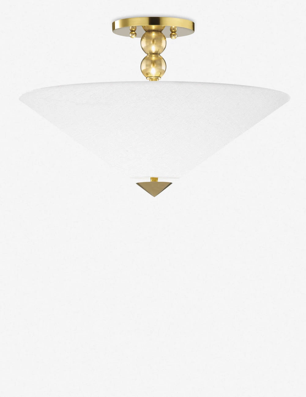 Contemporary shapes are everything with this flush mount, featuring a polished base and brass knob detailing. With its white Belgian linen shade, this flush mount fixture is a sleek and stunning addition to bedrooms, home offices and transitional spaces.